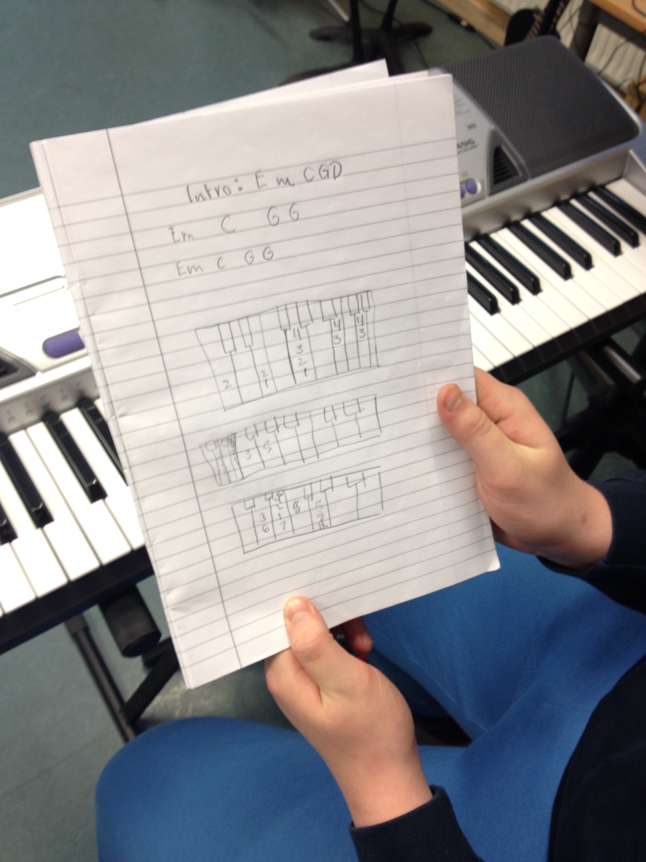 Jeg synes det er lurt å lære elever noter. Det er spesielt nyttig for trene på telling i musikk samtidig som elevene får kunnskap om tonene, skalaer og akkorder. Her har jeg imidlertid et bilde av systemet til en elev som skrev ned lead-melodien til “wake me up” av Avicii på sin helt egne måte. Denne eleven kan også noter, men det ville tatt for lang tid å skrive ned melodien, derfor fant han opp dette systemet istedet. Dette var en oppmuntring, vi lærer forskjellig og det handler om å finne den beste læringsmåten for seg selv!
