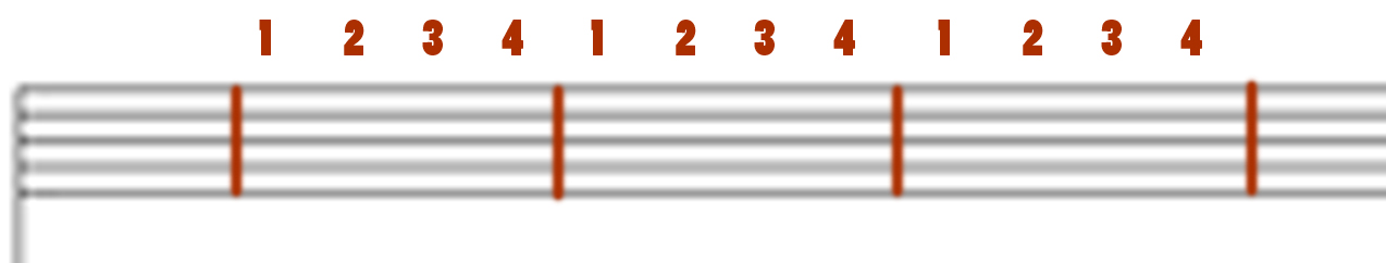Når man skal forklare rytme, er det lurt å starte med taktstrekene. Forklar at hver taktstrek fungerer på samme måte som et mellomrom mellom ord i en bok. Dersom man leser en hel bok uten mellomrom, blir det forvirrende og uoversiktlig. En taktstrek skiller mellom hver gang vi teller til fire f.eks. i en 4/4 takt. Tegn opp slik på tavla: