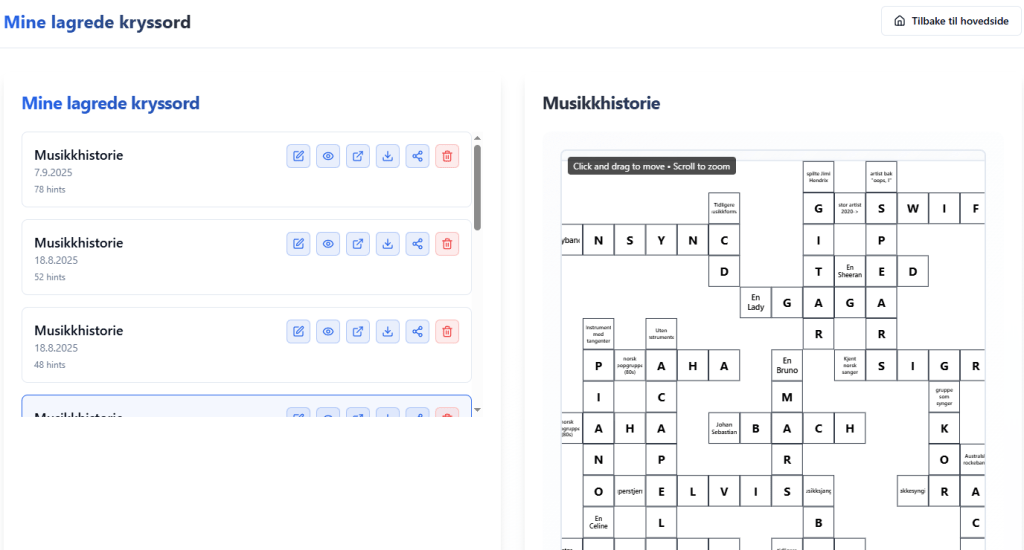 Jeg har lagt inn muligheter for samarbeid mellom brukere, hjelp fra AI til å komme med forslag til hint/svar, bildefunksjon og mulighet for å eksportere til PDF med både fasit og blanke ruter. Jeg har nok ikke tenkt på alt, men jeg håper appen faller i smak.